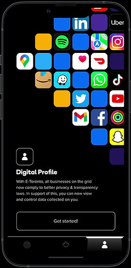 While E-Toronto looks to provide seamless experiences of accessing static data through the TO-Card, the mobile application offers access to a Digital Profile so that users can control all data that is collected on them. This includes the information within their data pockets and the ongoing data that they generate through various interactions with other smartphone applications. The objective is to provide control, and enable more contextual experiences by sharing a more authentic data profile.